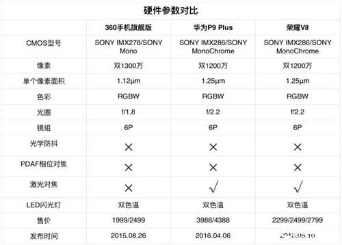 360手機旗艦版、華為P9 Plus和榮耀V8是三臺采用了雙攝像頭設計的手機,三臺手機在發布時間上跨度有九個月之久。