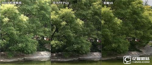 360手機旗艦版得益于自己的f/1.8大光圈,背景的虛化能力上要比華為P9 Plus和榮耀V8好上不少,而華為P9 Plus和榮耀V8實在是看不出有什么區別,非要摳的話,也只能說華為P9 Plus在背景樹林部分比榮耀V8好了那么一丁點。