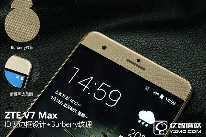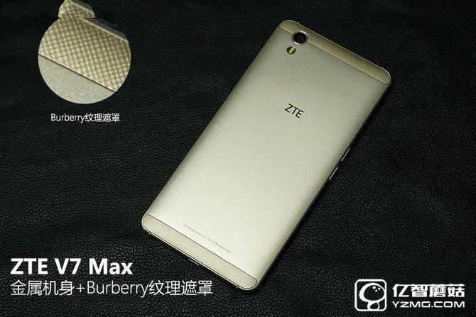 ZTE V7 Max采用了金屬機身,不同于廉價的金屬沖壓工藝,ZTE V7 Max的金屬機身是由金屬經過CNC切削而成,邊緣處有高光倒角,保證了整機的美觀,結構上也更加兼顧可靠。為保證信號溢出,上下各有一款較窄的復合材料蓋板,質地相對柔軟,有著皮質的觸感,也有Burberry紋路作為裝飾,與前面板形成呼應。