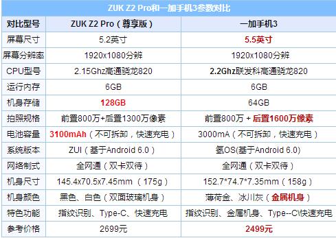 ZUK Z2 Pro和一加手機3參數(shù)對比