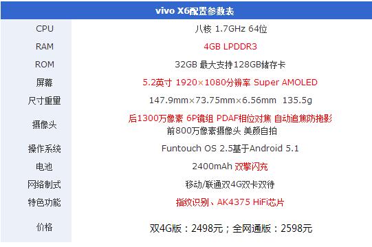 vivo X6擁有一塊5.2英寸的屏幕,分辨率為19201080,搭載一顆八核處理器,4GB RAM+32GB ROM,后置1300萬/前置800萬像素攝像頭,內置2400mAh電池,支持“雙擎閃充”、指紋識別,運行基于Android 5.1的Funtouch OS系統。