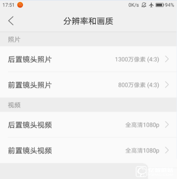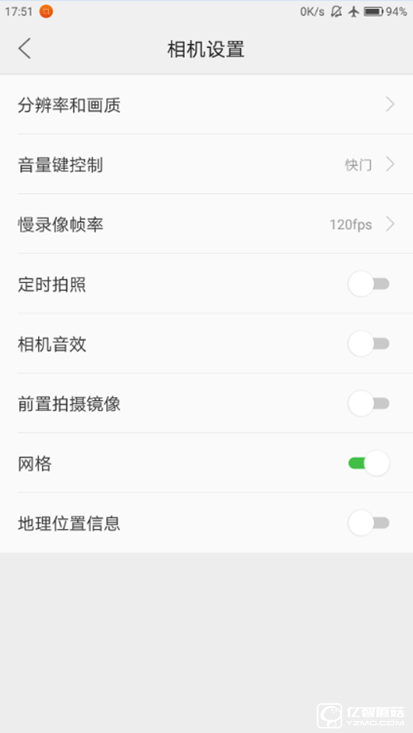 從沒見過如此精簡的相機設置界面。像筆者這種強迫癥患者每接觸一臺手機,都會盡可能強迫自己將系統設置選項從頭到尾翻一遍,如果系統設置選項過于復雜無疑讓俺覺得人生失去希望。值得一提的是加入了網格線選項,對于初學攝影用戶來說比較貼心。
