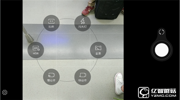 右邊功能鍵自上而下分別是打開相冊、切換到前置攝像頭、拍照鍵和切換到錄制視頻。一級設置菜單通過點擊屏幕左邊中間位置的齒輪裝圖案即可進入。