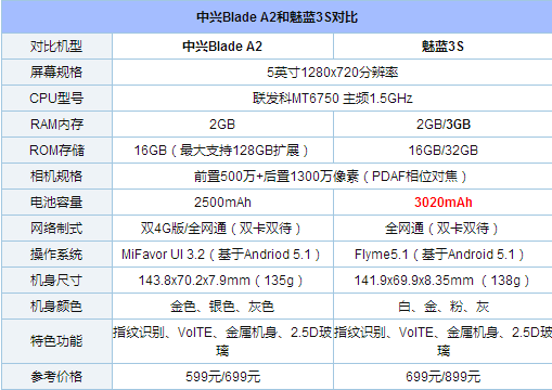 從魅藍3S和中興Blade A2參數對比來說,這兩款機型在硬件配置方面也有諸多的相同點,比如相同的處理器、內存存儲組合、屏幕大小及分辨率、攝像頭規格、網絡制式、特色功能等。而不同的在于電池容量、系統和價格。