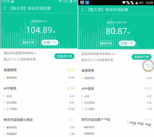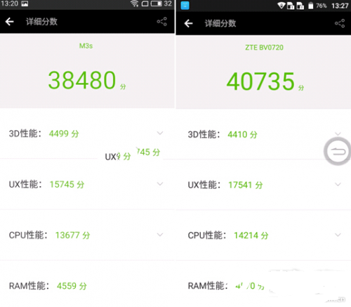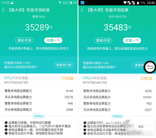 在魯大師下綜合性能評測,這兩款機型的跑分成績更接近一些,都是35000多分,各項目細節得分也差不太多。