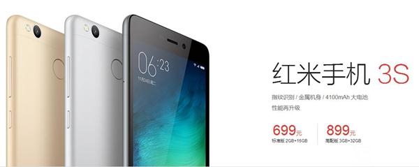 紅米3S依然分為標準和高配兩個版本,其中標準版(2GB內存+16GB存儲)售699元,高配版(3GB內存+32GB存儲)售899元。