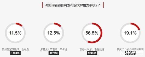 在格力手機2上市之前,有近萬網友參加格力手機2的投票,投票結果顯示,高達56.8%的用戶認為格力手機2代的定位價格太坑爹,看看就好。
