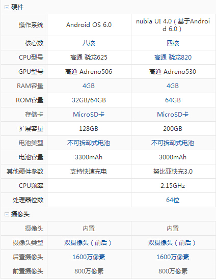 nubia Z11搭載驍龍820處理器,有4GB/6GB兩種內存版本可選,支持200GB存儲擴展,在網絡制式上,雙卡雙待全網通4G+(可LTE+W),支持VoLTE、首發(fā)驍龍820 Tru-Siginal信號增強,支持NFC,紅外遙控功能。