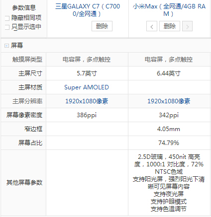 三星 C7和小米 Max配置參數詳細對比: