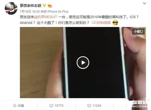 林志穎在這條微博中稱:“朋友送來@機甲MESUIT一臺,感覺這可能是2016年最酷的黑科技了。iOS?Android?這個太酷了!你們是怎么做到的?”