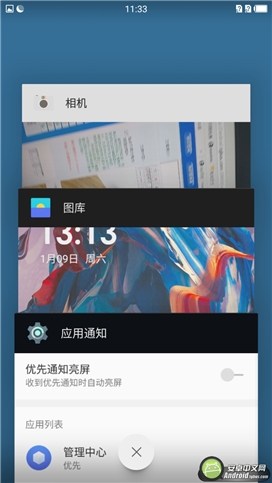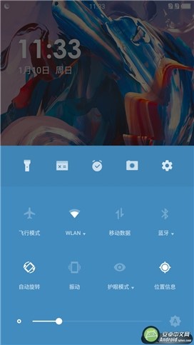 氫OS的下拉通知菜單非常簡潔,如果沒有通知消息我們下滑它在頂部只會出現一個時間日期的顯示框,然后整體桌面鋪上一層半透明模板,證明無多余消息顯示,而且不影響桌面上的內容。上劃則會呼出快捷任務欄,從里面可以快捷打開某些功能,也能調節屏幕亮度。