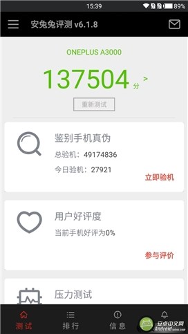 ▲用安兔兔跑分軟件測試,一加手機(jī)3的分?jǐn)?shù)為137504分。