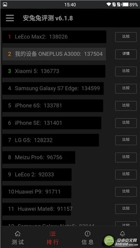 其實(shí)我們從它搭載的硬件配置中就能看出,一加手機(jī)3絕對是目前安卓手機(jī)中最頂級的配置了,所以跑分也只是個(gè)從側(cè)面證明的數(shù)據(jù)。在目前排行榜中排名第二,與第一名相差500分左右,而且跑分每次都會有誤差。從配置和售價(jià)方面來看,它絕對算的上是“旗艦機(jī)殺手”了。
