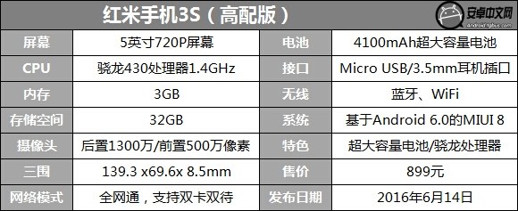 紅米手機3S采用手感適中的5英寸屏幕,搭載高通驍龍430八核處理器,內(nèi)置3GB+32GB的內(nèi)存組合,擁有4100mAh的大容量電池,前置500萬像素攝像頭,后置1300萬像素攝像頭,并且支持指紋識別功能。
