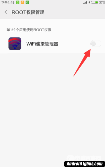 接著在“授權(quán)管理”界面中,點(diǎn)擊“ROOT權(quán)限管理”項(xiàng),并在其授權(quán)界面中,開(kāi)啟想要申請(qǐng)ROOT權(quán)限的應(yīng)用,即可允許指定應(yīng)用使用紅米Pro手機(jī)ROOT權(quán)限。
