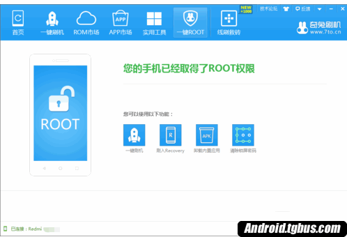 當(dāng)刷機(jī)操作完成后,直接切換到“一鍵ROOT”選項(xiàng)卡,點(diǎn)擊“開(kāi)始ROOT”按鈕,此工具將自動(dòng)從云端下載ROOT方案,并自動(dòng)完成紅米Pro手機(jī)的ROOT操作。