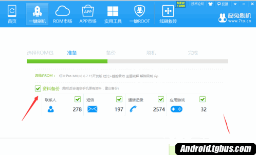 首先是驗(yàn)證,驗(yàn)證通過(guò)之后,便進(jìn)入正式刷機(jī)過(guò)程,如圖所示,在此需要對(duì)手機(jī)重要數(shù)據(jù)資料進(jìn)行備份操作,勾選想要備份的手機(jī)數(shù)據(jù) ,點(diǎn)擊“開(kāi)始刷機(jī)”操作。