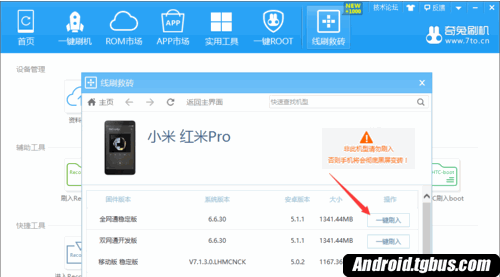 切換到“線刷救磚”選項(xiàng)卡,找到“紅米Pro”對(duì)應(yīng)的線刷包,并在其詳情界面中點(diǎn)擊“一鍵刷入”按鈕,以便對(duì)紅米Pro進(jìn)行修復(fù)救磚操作。