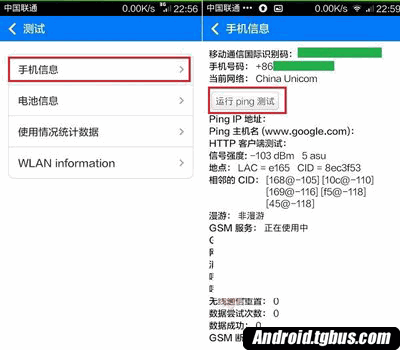 在安卓手機撥號界面輸入:*#*#4636#*#* 完成后,手機會進入Android工具測試界面,然后點擊「手機信息」,之后再點擊「運行ping測試」如下圖。