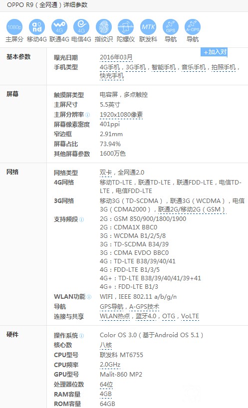 手機內置聯發科Helio P10 MT6755 2.0GHz八核64位處理器,搭配4GB RAM,內置64GB機身存儲空間,支持128GB microSD卡擴展。作為一款全新 的智能手機,OPPO R9全網通 版本支持中國聯通、中國移動和中國電信的4G/3G/2G網絡。全新的全網通2.0,允許用戶任意將移動4G卡、聯通4G卡 和電信4G卡搭配使用,任意一張卡都可選4G網絡,另一張為2G網絡。