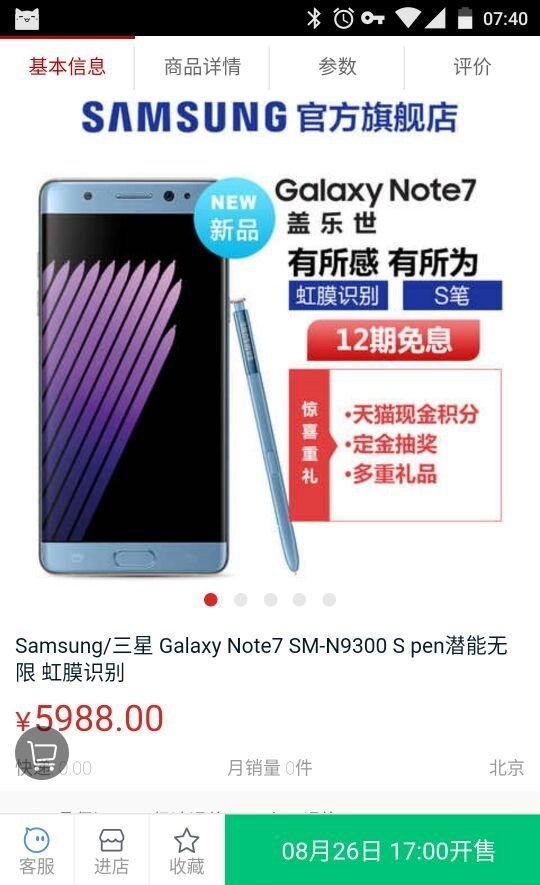 有網友發現,三星天貓旗艦店商品頁面出現了Note 7國行的售價信息,其會在于8月26日下午17:00開售,64GB版本售價為5988元,比之前的預想貴了一些。