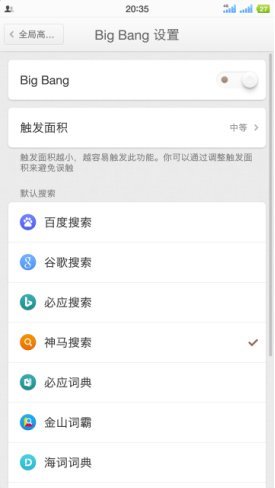 接著就是重頭戲之一的bigbang,也就是大爆炸。進入全局高級設置里面就可以開啟這個功能了。Bigbang的搜索引擎有很多種,用戶可以自行選擇。老羅在發布會上演示了bigbang這項功能,它可以快速的讀取窗口中的文字、英文進行翻譯、轉發、復制等。更厲害的是可以讀取照片中的文字內容。能夠快捷高效的幫助我們處理文字內容。