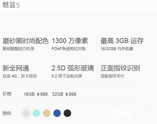 魅藍5依舊主打多彩,擁有藍色、金色、白色、綠色、黑色等多種機身顏色可選。