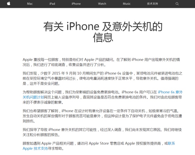 11月20日,蘋果發布聲明確認,有極少數的iPhone 6s設備可能會意外關機。稱僅會影響序列號在一定范圍內的,生產日期為2015年9月到10月之間的設備。蘋果承諾,這部分手機可免費更換電池。蘋果今日還放出了序列號查詢工具(https://www.apple.com/cn/support/iphone6s-unexpectedshutdown/)。