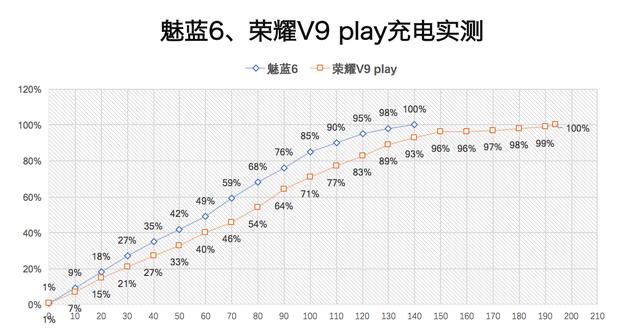 兩款手機同時從1%的電量開始重啟,保證在同一環境中不受其他因素影響。在前期兩款手機的充電時間都比較快速,從前五分鐘,魅藍6就與榮耀V9 play拉開距離,在80分鐘時,兩款手機之間的差距拉到了最大,為14%。要知道魅藍6搭載的可是3070mAh電池,要比榮耀V9 play多出70mAh。