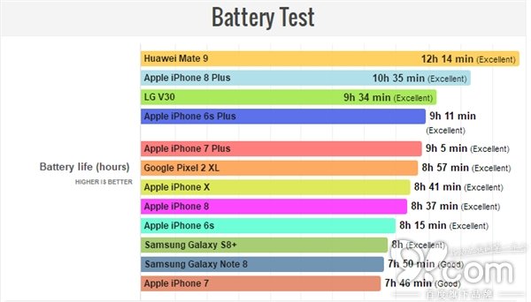 這樣的結(jié)果總的來(lái)說(shuō)還算優(yōu)秀,相比更大電池容量的三星Galaxy S8+/Note 8好得多,同時(shí)略高于iPhone 8,但是遠(yuǎn)遠(yuǎn)不如iPhone 8 Plus(超過(guò)十個(gè)半小時(shí)),也比Pixel 2 XL差一些。