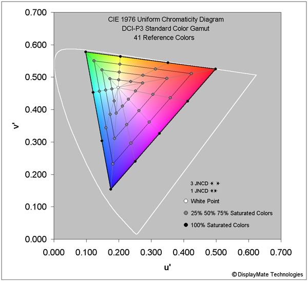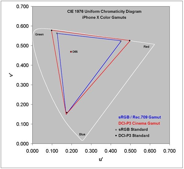 iPhone X支持兩大色域,分別是消費級領域最普及的sRGB/Rec.709、4K電視和數字影院上標準的DCI-P3,測試表明 iPhone X在兩種色域里的可視色差分別只有1.0 JNCD、0.9 JNCD,基本上已經無可挑剔了。