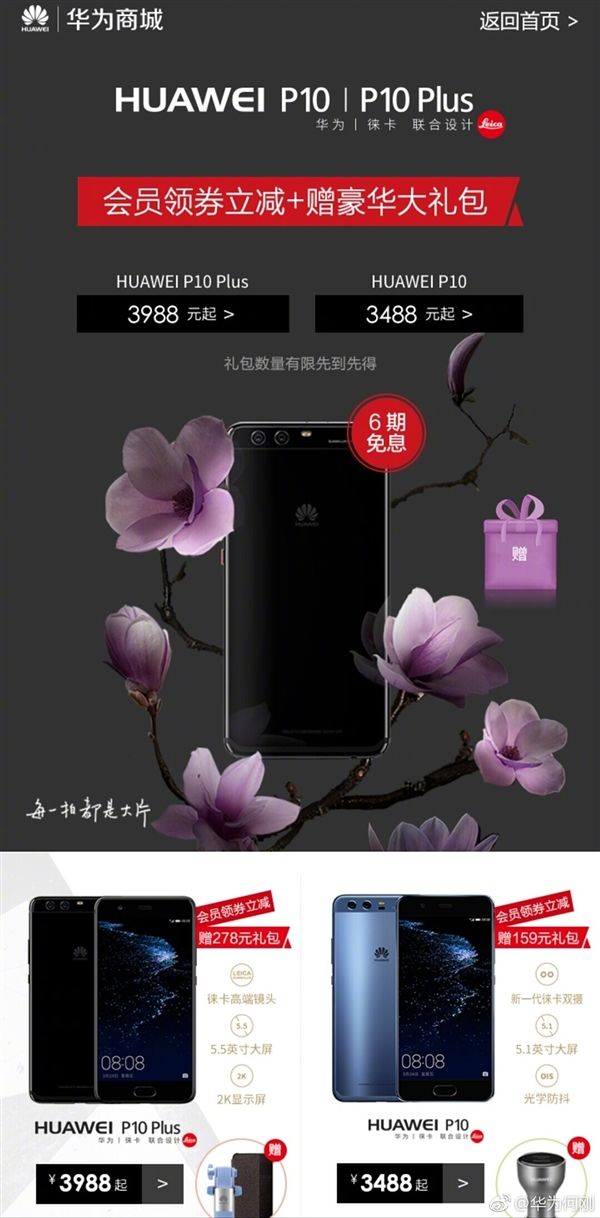 今天華為手機產品線總裁何剛表示, 華為P10系列現在優惠促銷,領券立減300元,實際售價3188元(4+64GB版本)。