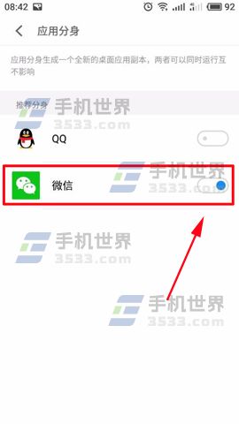 2)接著再點擊進入【應用分身】菜單項,進去后找到要進行分身的應用點擊旁邊的【按鈕】就可以進行分身了。(如下圖)