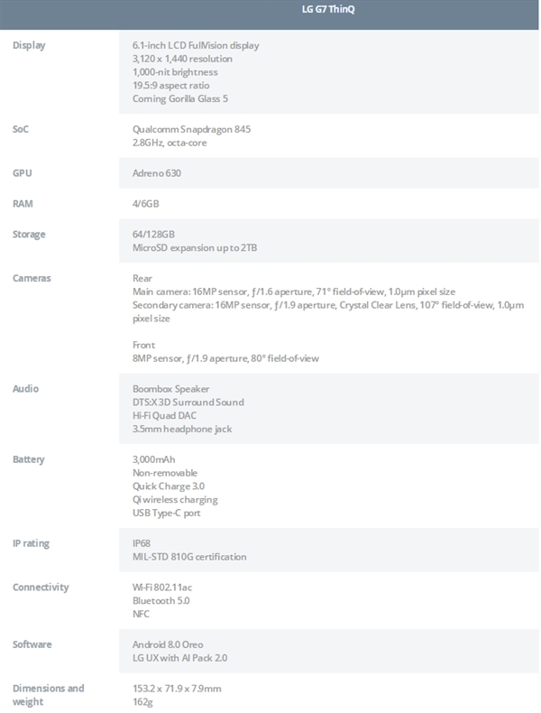 LG G7 ThinQ發(fā)布 驍龍845芯片/雙玻璃機(jī)身+劉海屏,還有Hi-Fi