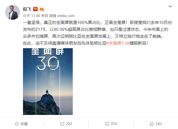 或許正因為如此,努比亞好像和“全面屏”這個話題杠上了。今天上午,努比亞手機聯合創始人倪飛在微博上正式公布了新旗艦的消息。他表示,全面屏3.0的時代就要來了。