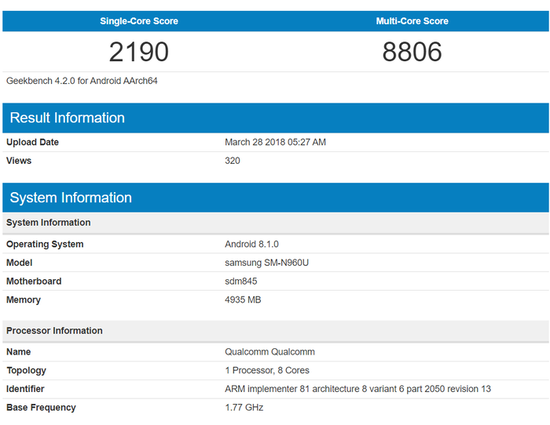 根據之前GeekBench的跑分數據來看,今年的三星Galaxy Note 9同樣會采用驍龍+三星雙處理器的銷售方式。在中國等國家出售驍龍845版本,而在其他國家或地區出售三星Exynos 9810處理器版本。、