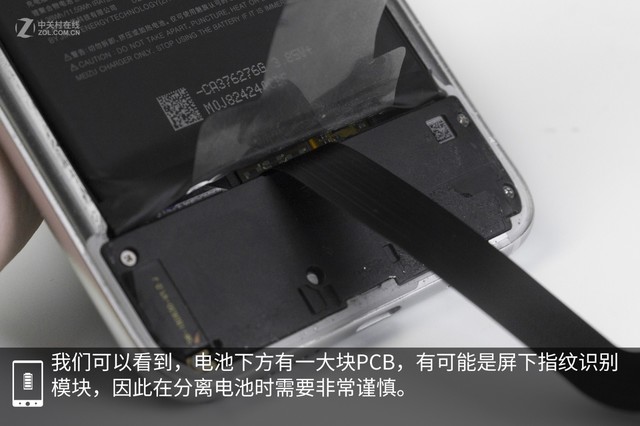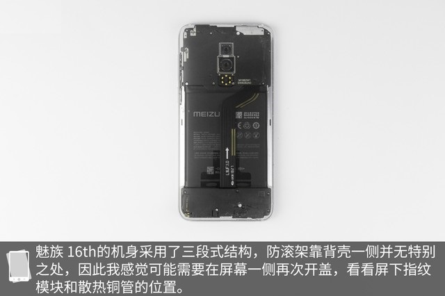 通過艱難的分離后蓋之后,就可以看到魅族16手機內部結構了,內部為常見的三段式結構,防滾架背殼一側并無特別之處,因此我們感覺可能需要在屏幕一側再次開蓋,看看屏下指紋模塊和散熱銅管的位置。