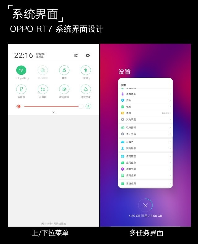說完外觀,我們再看看系統,OPPO R17采用了基于Android 8.1的ColorOS 5.2系統,在此前的智能生活功能的基礎上加入了TOP應用專項優化功能。其系統風格也向OPPO Find X看齊,讓人感到耳目一新。