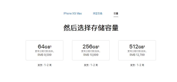 iPhone XS Max 64GB、256GB和512GB對應(yīng)售價分別是9599元、10999元和12799元;