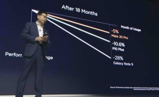 比如多次強調自身產品“18 個月不卡頓”的華為就自制了一份圖表,圖表顯示預計 18 個月后 P10 Plus 的流暢性下滑 10.6%,三星 Note 9 下滑 28%。雖然我們不知道這是如何統計的,也不保證華為的數據一定正確,但結合我們的實際體驗,這樣的預測完全有可能發生,至少性能衰減是會出現的。