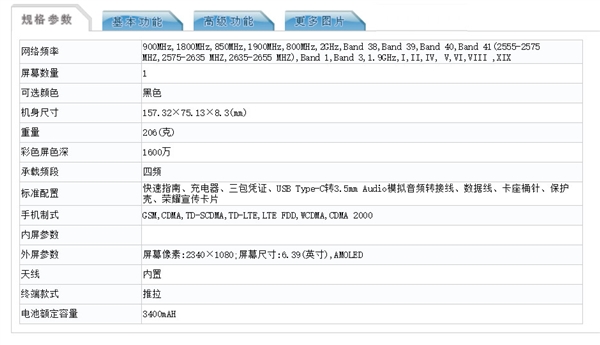 從工信部頁面參數來看,榮耀Magic 2三圍尺寸157.32×75.13×8.3mm,重量206g。采用6.39英寸AMOLED顯示屏,分辨率2340×1080,內置3400mAh容量電池,無3.5mm耳機孔。