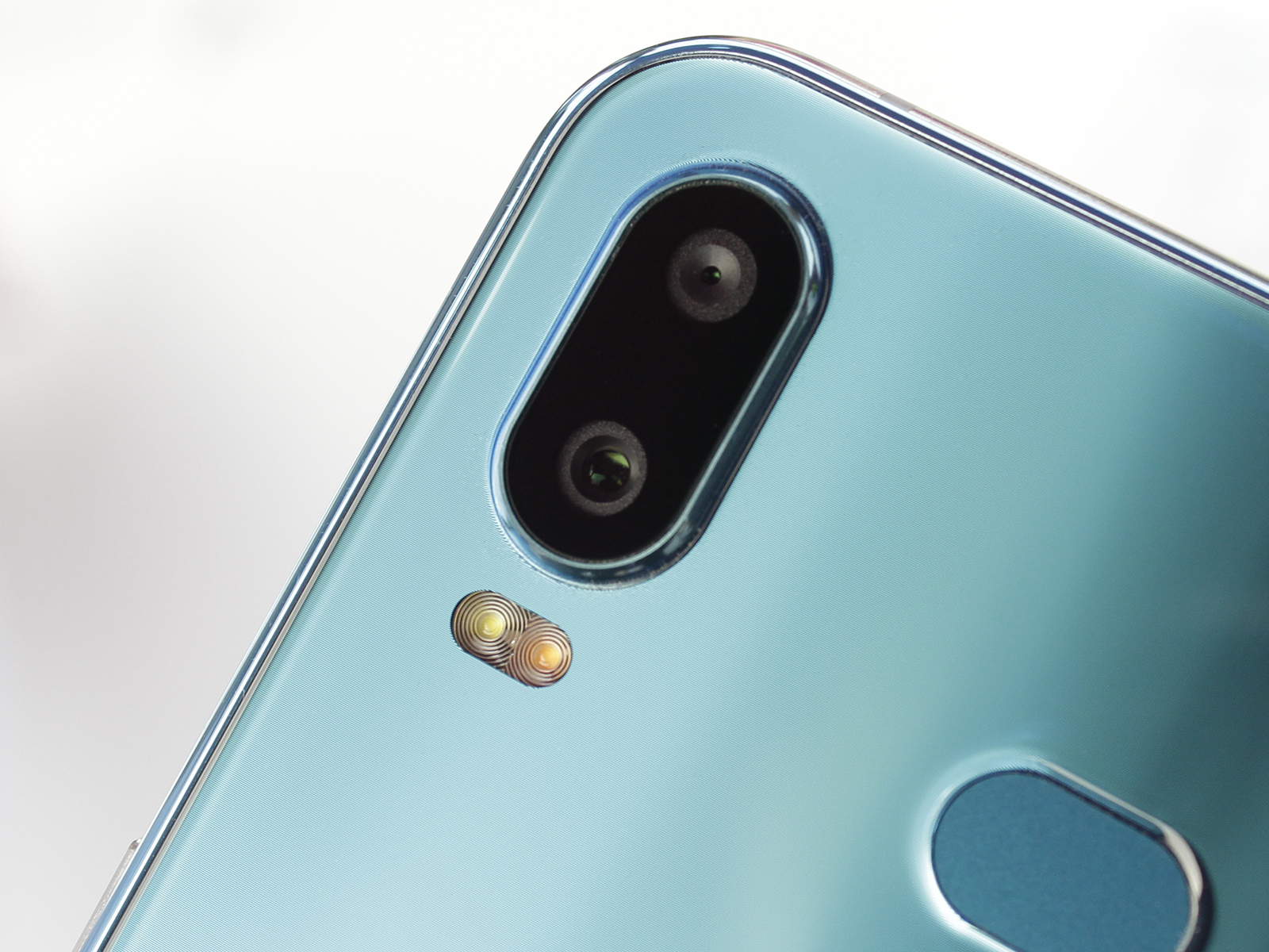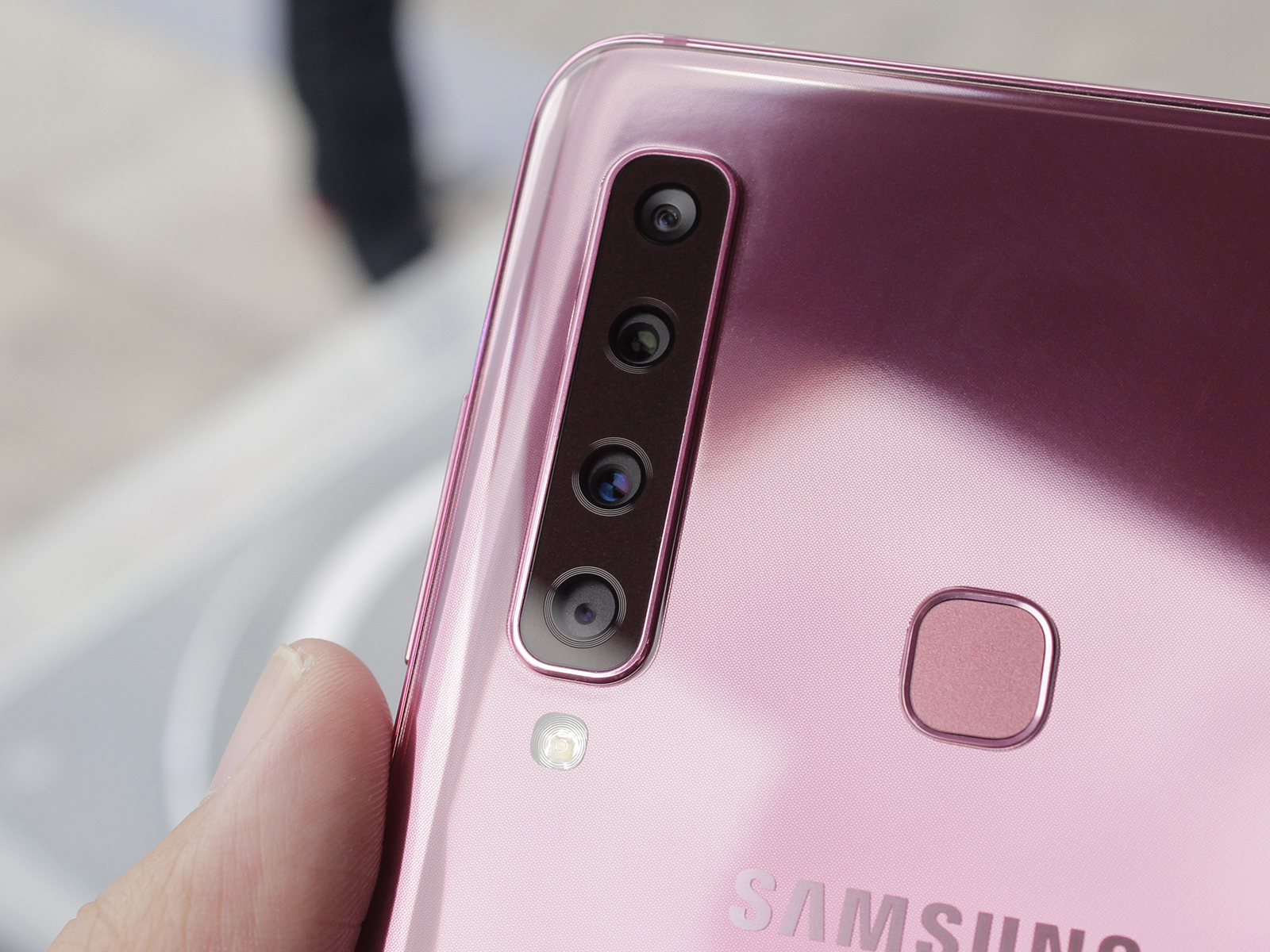 Galaxy A9s是首款搭載后置四攝的手機。由上到下分別是800萬像素超級廣角鏡頭、1000萬像素長焦鏡頭、2400萬大光圈主攝和500萬像素景深鏡頭。