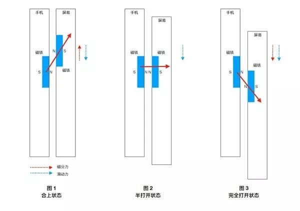 小米MIX 3用稀土永磁鐵組替代了傳統(tǒng)的彈簧結(jié)構(gòu),將磁鐵的磁力轉(zhuǎn)化為機械力,通過磁鐵“同極相斥”的特性為屏幕提供上滑的回彈力,以及在滑動過程中的阻尼感。
