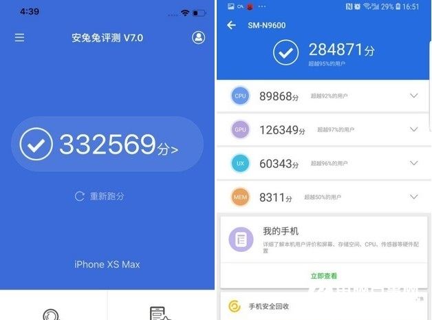 性能方面,三星Note9搭載的是高通驍龍845處理器,基于10nm制程,而iPhone XS搭載的是蘋果自家的A12六核處理器,基于目前最先進的7nm工藝制程,以下是這兩款手機安兔兔跑分對比。