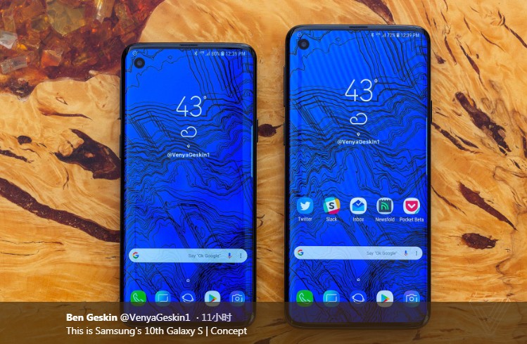 今天凌晨,@VenyaGeskin1又放出了一組S10的渲染圖,圖中出現了兩款手機,一大一小,有網友推測應該是5.8英寸的曲面屏版本和6.4英寸的屏幕S10 Plus。從渲染圖來看,最明顯的一個特征就是手機左上角的攝像頭鑲嵌在屏幕內,但是這枚攝像頭在亮屏時似乎在遮擋屏幕的顯示區域。