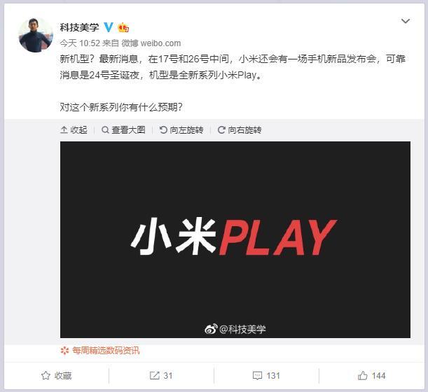 今天,博主@科技美學 給出了一個信息,稱小米將在24號圣誕夜當天有一場發布會,而這次的新品是小米的全新系列小米Play。也就是說,小米將在今年底推出一個全新的系列,考慮到林斌此前的自曝,小米Play應該就是這個4800萬的小米新機。