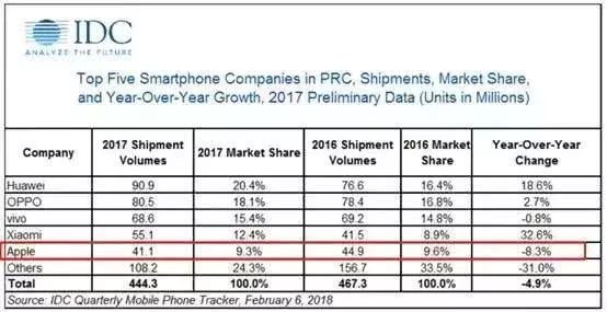 而到了2017年,iPhone在中國的出貨量、市場份額已滑落到了第5位,排在華為、OV、小米之后。
