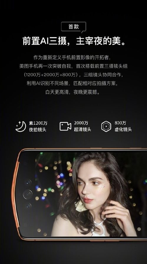 首先是相機方面,美圖V7采用了全球前置搭載三顆RGB攝像頭(SONY IMX363 1200萬像素+SONY IMX350 2000萬像素+SONY IMX355 800萬像素),配合全新的AI算法,前置三攝可以自動進行SAT切換(模組切換),讓不同的鏡頭組合在不同場景下都能發揮最大功效。為了提升拍照效果。