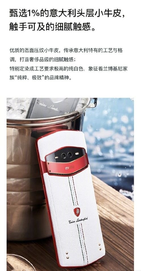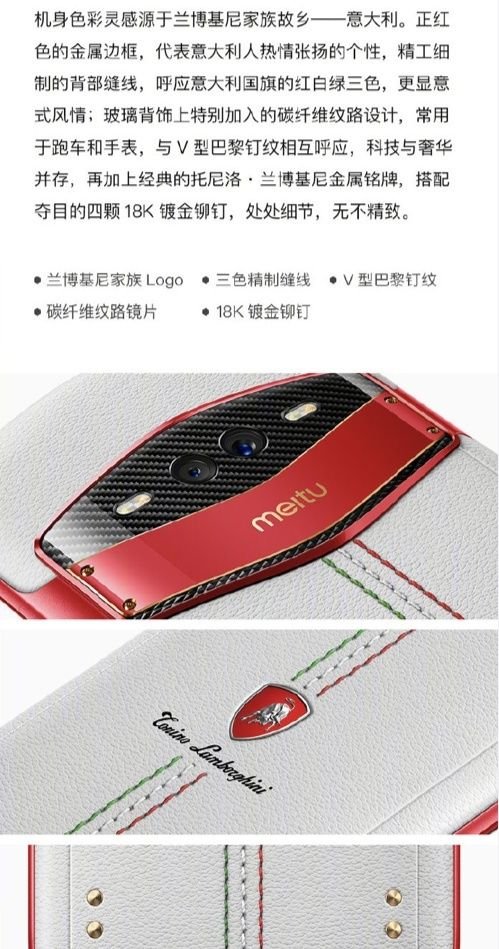 后置攝像頭下方裝飾以“鉆石尖端”紋路的巴黎釘紋,與底部四顆18K鍍金鉚釘交相輝映,呈現出藝術質感。此外美圖此次與托尼洛·蘭博基尼家族進行合作,白色的皮質以及紅綠的車線縫制,配合背部的蘭博基尼家族logo,都使得這款產品的尊貴感油然而生。