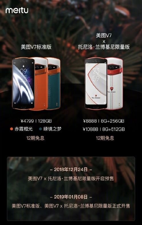美圖V7標準版售價為4799元,提供綠境之夢、赤霞橙光兩種顏色,將于1月8日在美圖官網、天貓、京東、蘇寧各大平臺現貨開售。美圖V7X托尼洛•蘭博基尼限量版官方指導價8GB+256GB版8888元,8GB+512GB版10888元,將于12月24日開啟預售。